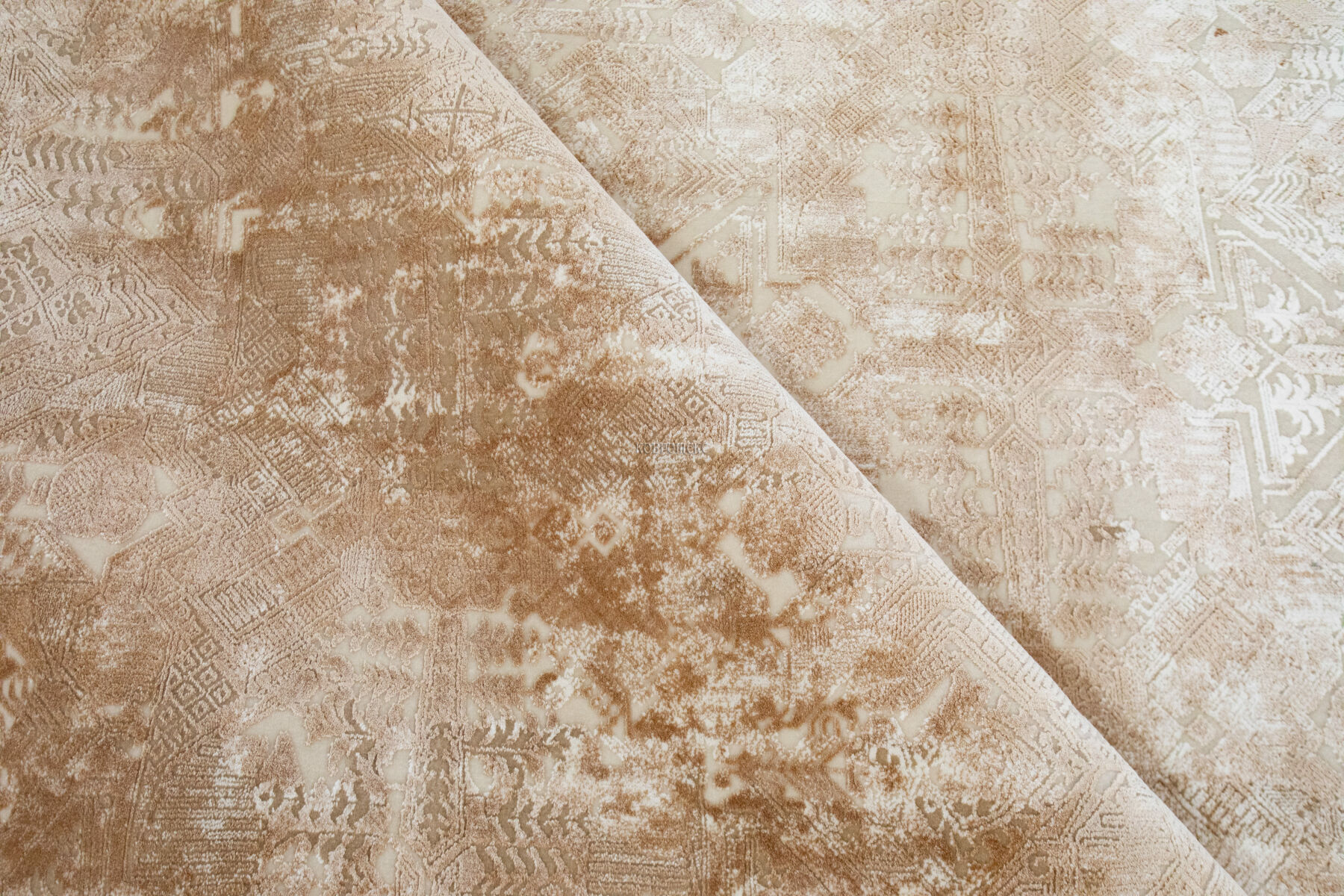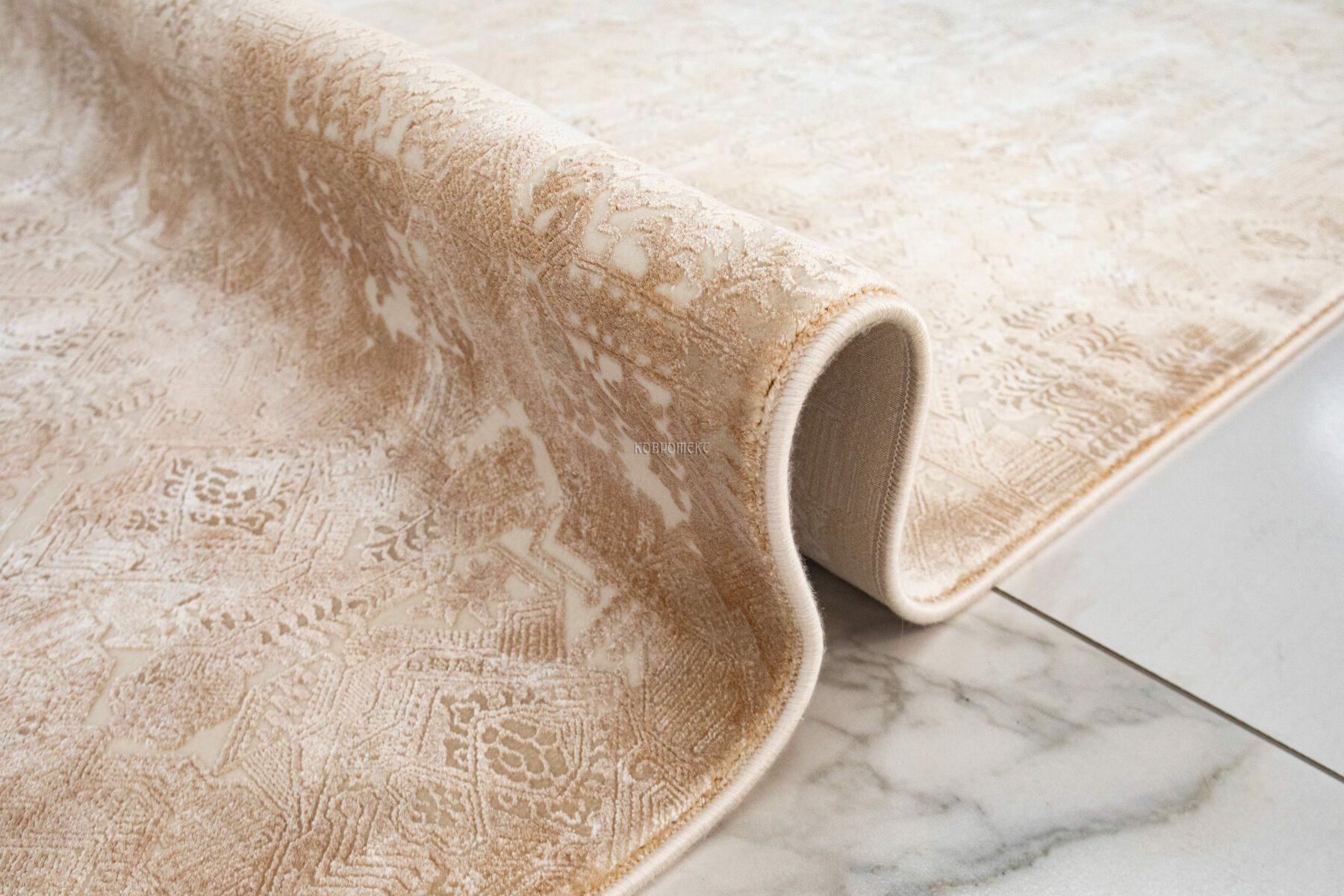 Невероятно плотный ворс 3,6 млн. точек/м2 из смеси эвкалиптового шёлка и акрила привлекает своей мягкостью, удивляя очень высокой детализацией рисунка. Нежные шелковистые нити красиво блестят, переливаясь на свету, а акриловые волокна прекрасно имитируют натуральную шерсть. В зависимости от угла обзора рисунок и оттенок такого ковра воспринимается по-разному: против ворса узор выглядит чётким и насыщенным, по ворсу - более светлым и приглушенным. Короткий ворс 6 мм в совокупности с высокой плотностью обеспечивает хорошую износостойкость и долговечность изделиям.